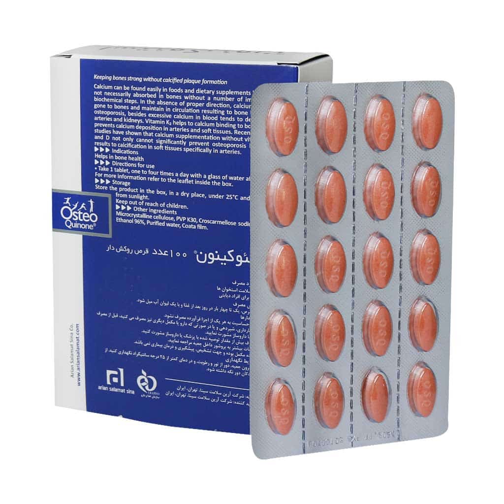قرص osteo یکی از معدود مکملهای کلسیم خوراکی است که در شریانها رسوب نمیکند. به علت ترکیباتی همچون ویتامین k3 و d3 در استئوکینون، این مکمل به حفظ سلامت بافت استخوانی و پیشگیری از پوکی استخوان کمک شایانی مینماید. osteo quinone یک داروی موثر است که جهت جلوگیری یا درمان سطح پایین کلسیم در خون برای افرادی که کلسیم کافی از رژیم غذایی دریافت نمیکنند، استفاده میشود. همچنین استئوکینون مکملی است که برای افراد خاص از جمله زنان باردار، زنان شیرده و زنان یائسه که به مقدار کافی کلسیم دریافت نمیکنند، توصیه میشود.