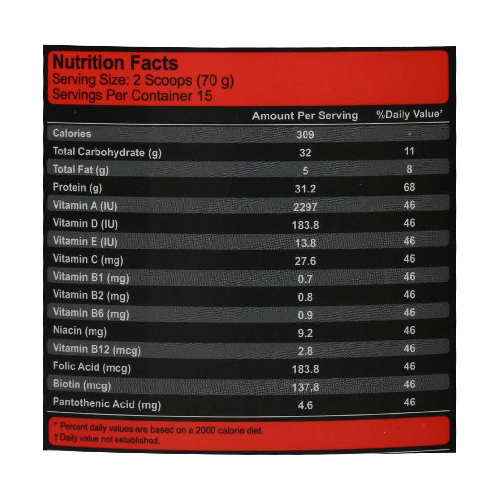 پروتئین غلیظ شده آب پنیر، پروتئین ایزوله آب پنیر، پودر سفیده تخم مرغ، پروتئین غلیظ شده شیر، کازئینات سدیم، الگولوتامان، مالتودکسترین، شکر، دکستروز، گوارگام، رنگ و طعم دهندههای مجاز، مجموعه ویتامینها